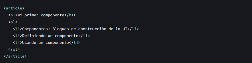 React te permite combinar tu marcado, CSS y JavaScript en «componentes» personalizados, elementos reutilizables de UI para tu aplicación. El código de la tabla de contenidos que viste arriba pudo haberse transformado en un componente <TableOfContents /> que podrías renderizar en cada página. Por detrás, seguiría utilizando las mismas etiquetas HTML como <article>, <h1>, etc.