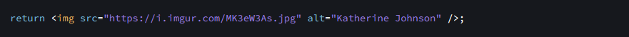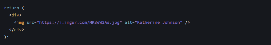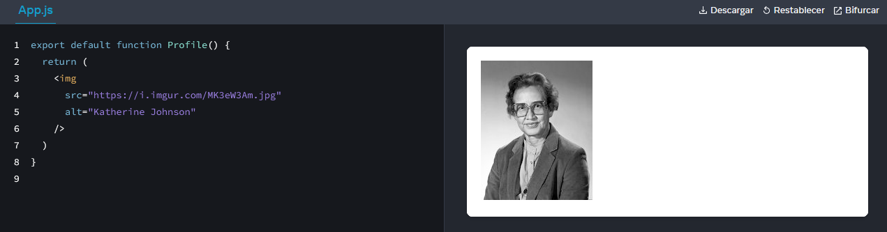 El componente retorna una etiqueta <img /> con atributos src y alt. <img /> se escribe como en HTML, ¡pero en realidad es JavaScript por detrás! Esta sintaxis se llama JSX, y te permite incorporar marcado dentro de JavaScript.