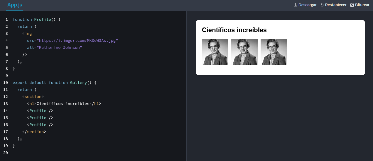 Dado que los componentes Profile se renderizan dentro de Gallery —¡incluso varias veces!— podemos decir que Gallery es un componente padre, que renderiza cada Profile como un «hijo». Este es la parte mágica de React: puedes definir un componente una vez, y luego usarlo en muchos lugares y tantas veces como quieras.