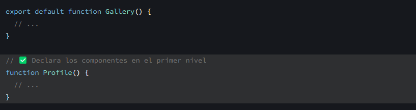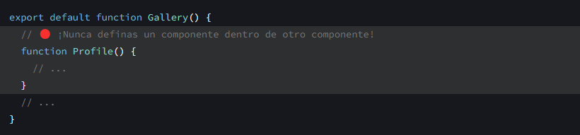 Los componentes pueden renderizar otros componentes, pero nunca debes anidar sus definiciones: